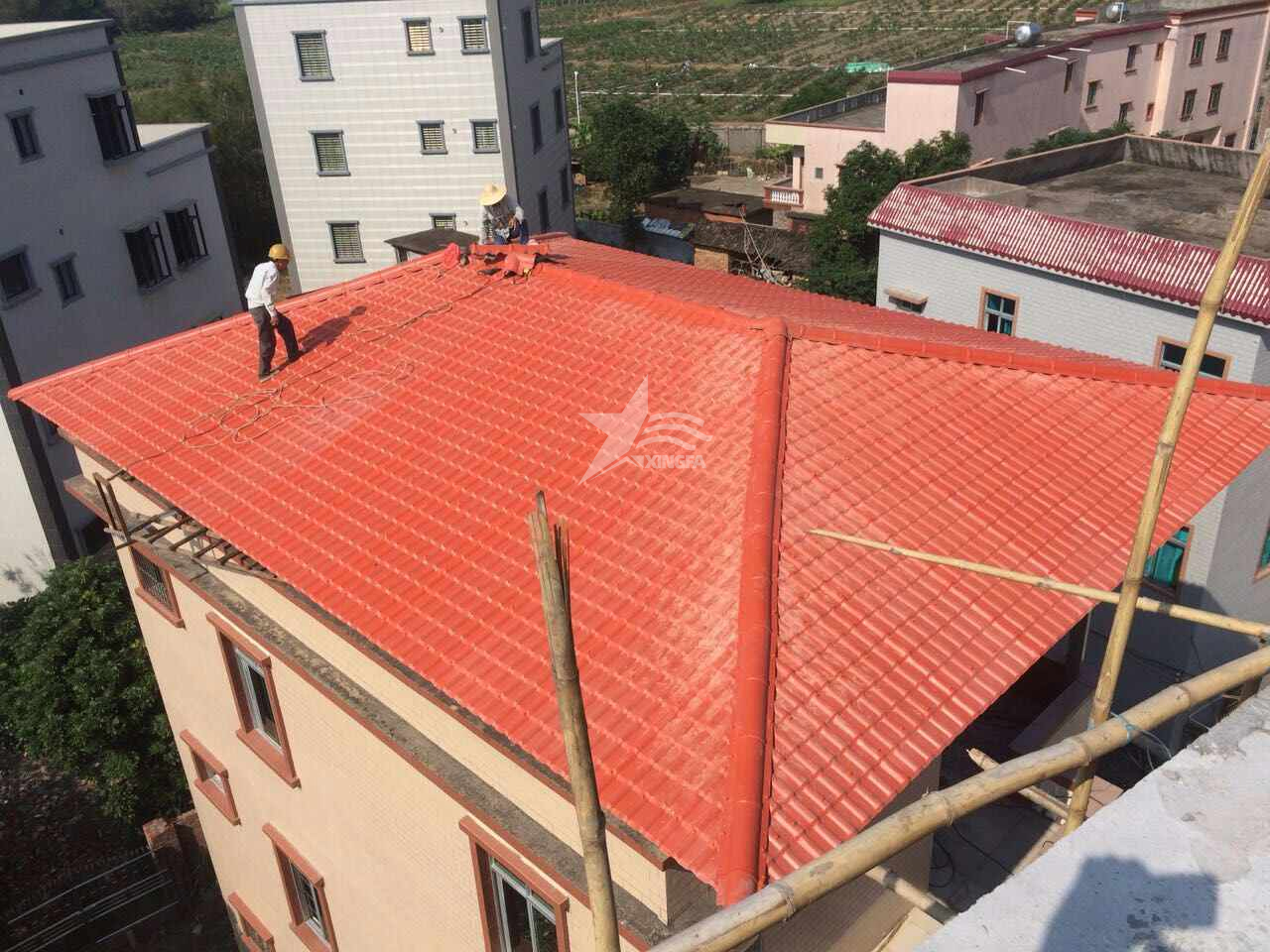 在完成防水層的鋪設后,再覆蓋保溫層和樹脂瓦,從而完成整個屋面的防水、保溫和瓦板覆蓋工作。